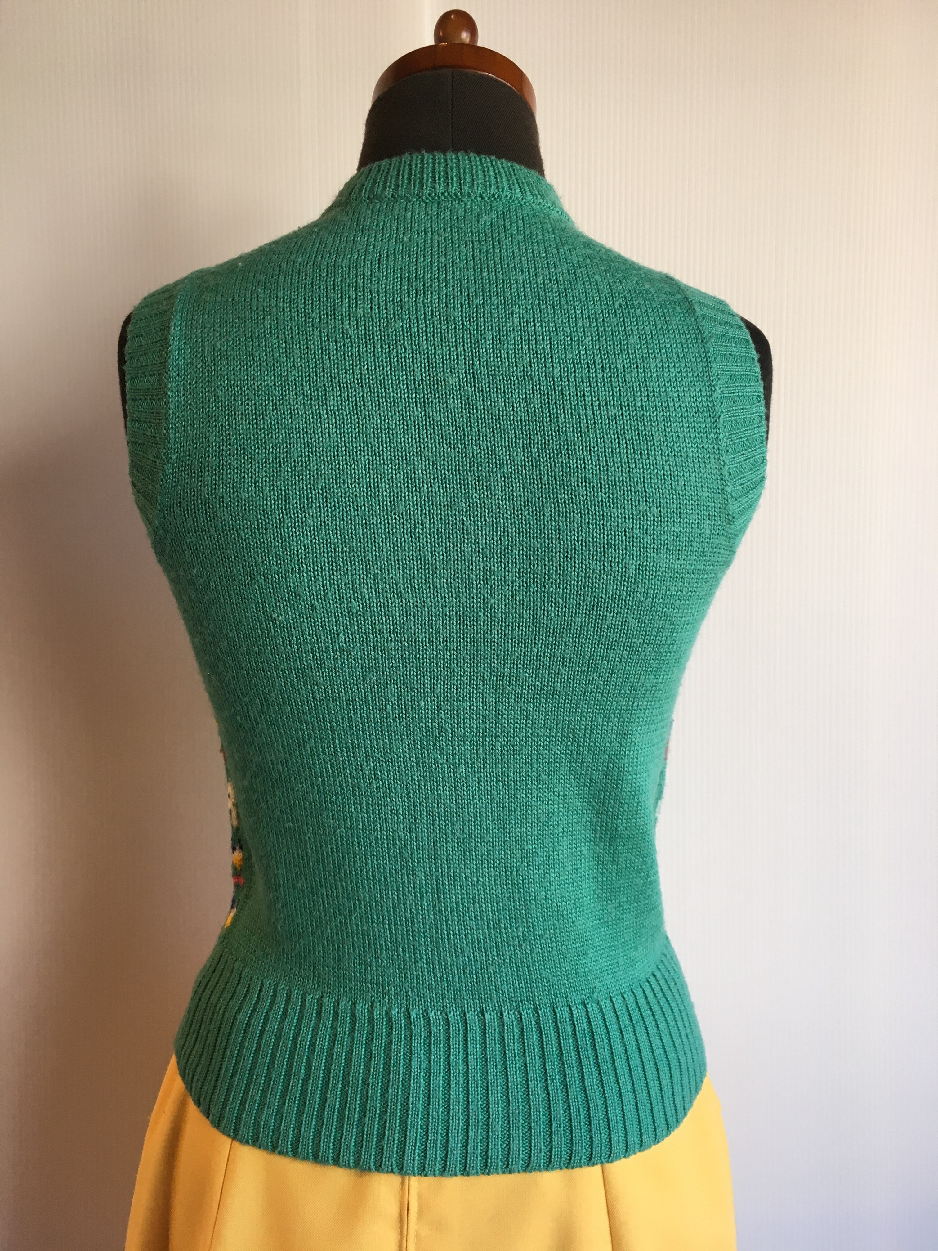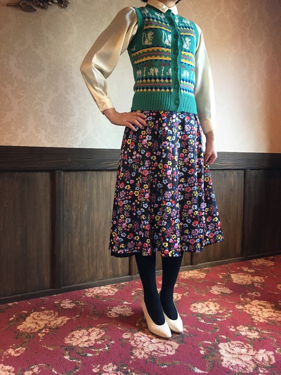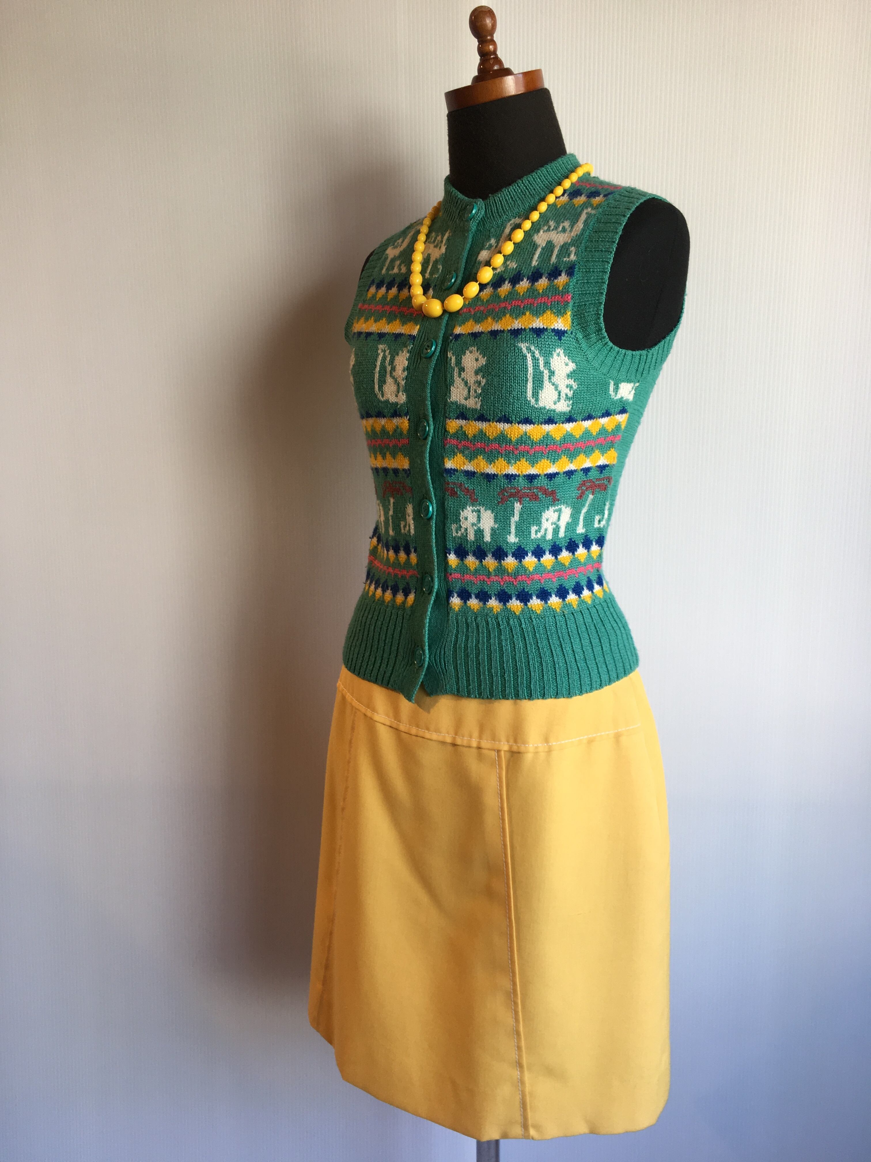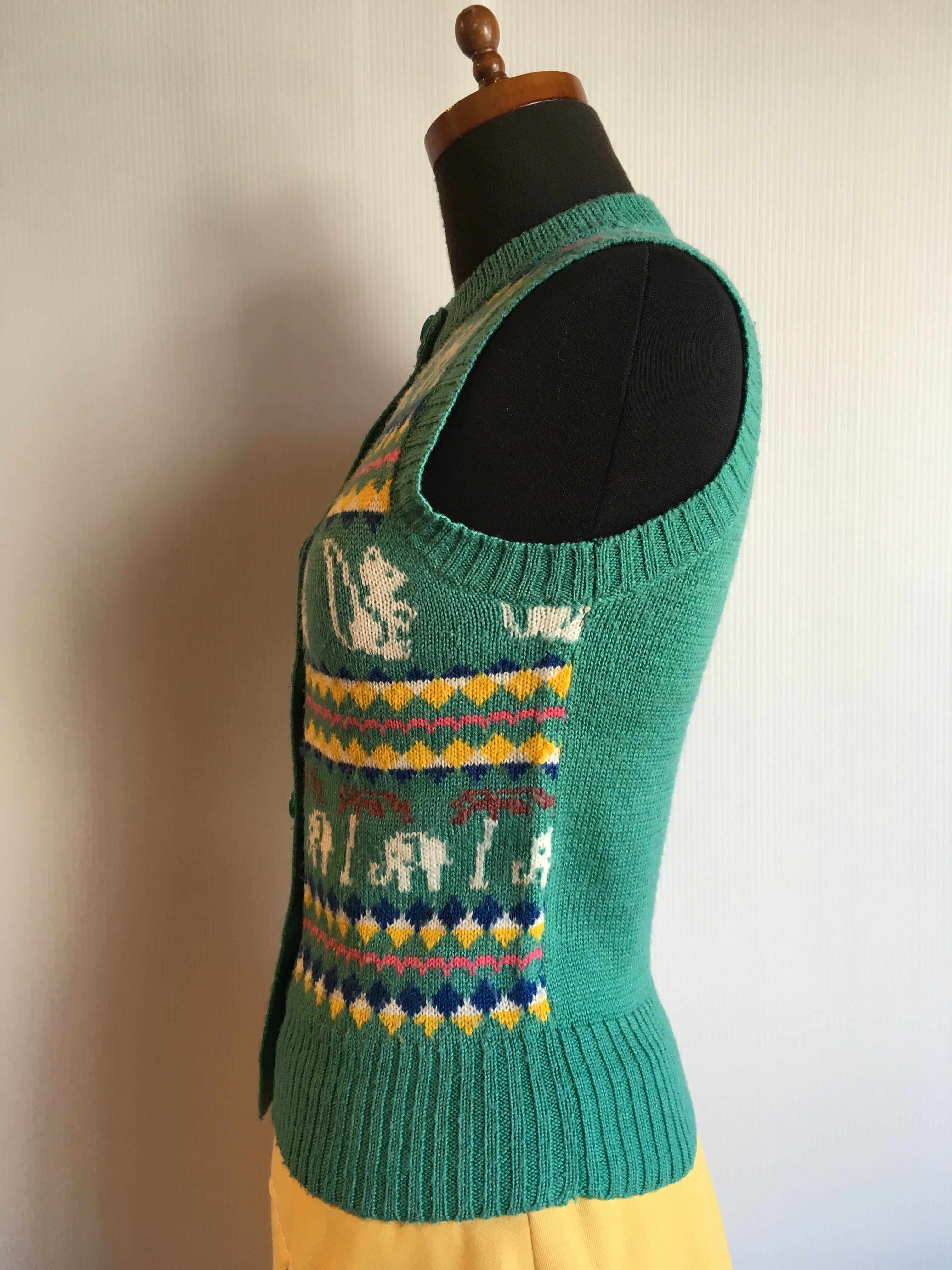エメラルドグリーンのニットに、リスやゾウの柄が、レトロで可愛いです。