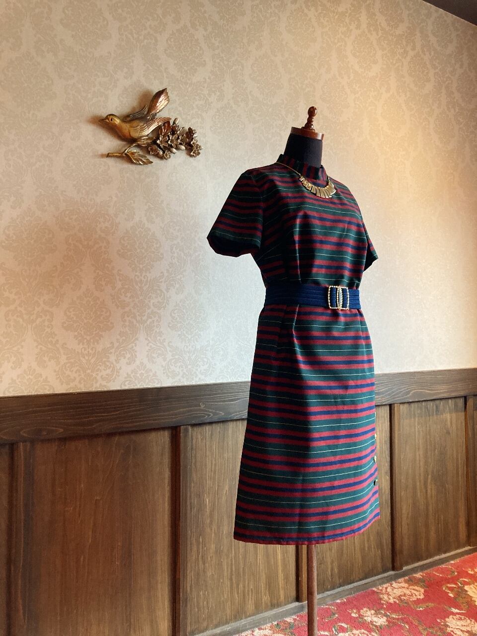 モスグリーン×ワインレッド×ネイビーのボーダーがレトロ。