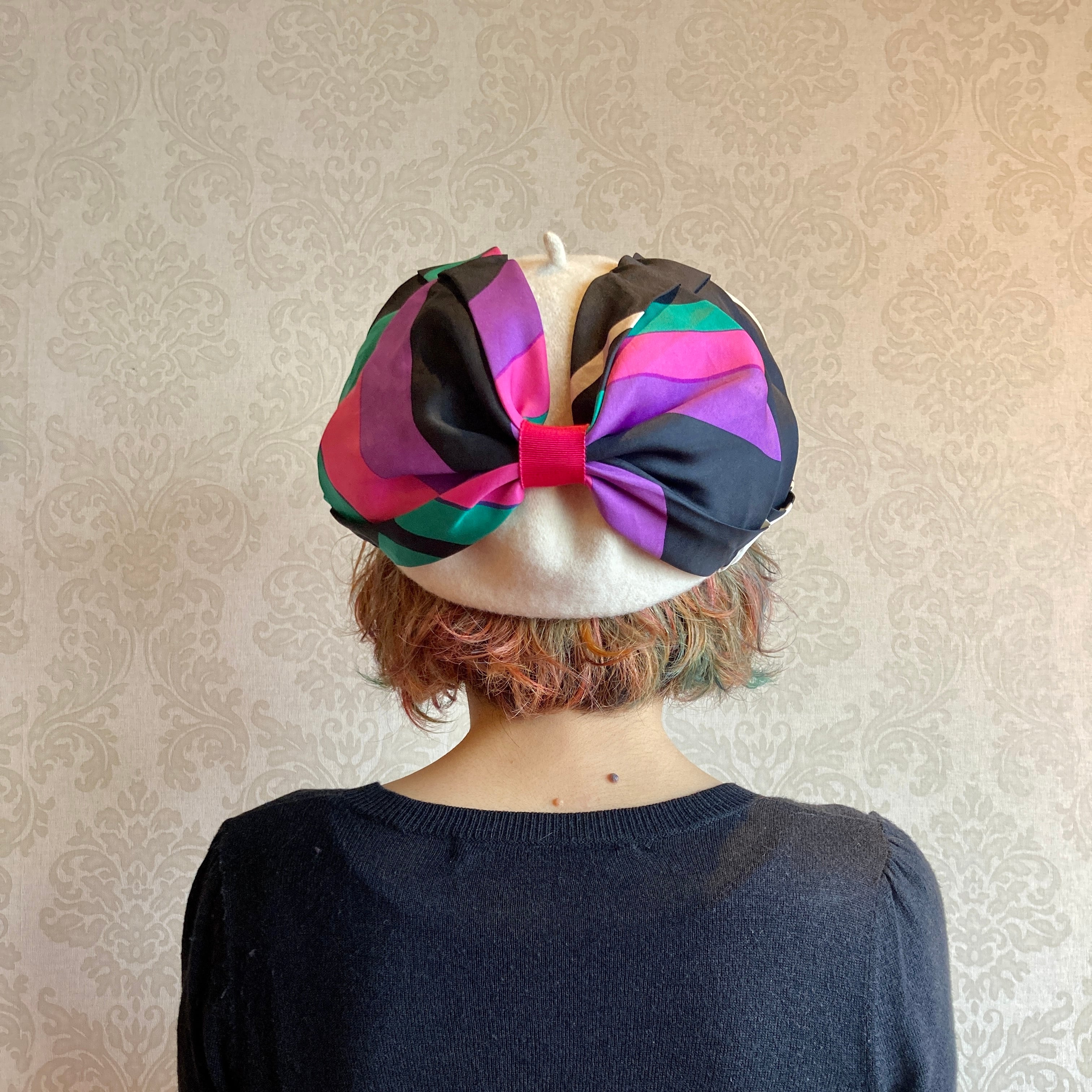 モアリボンベレー帽 オフホワイト×カラフル幾何学