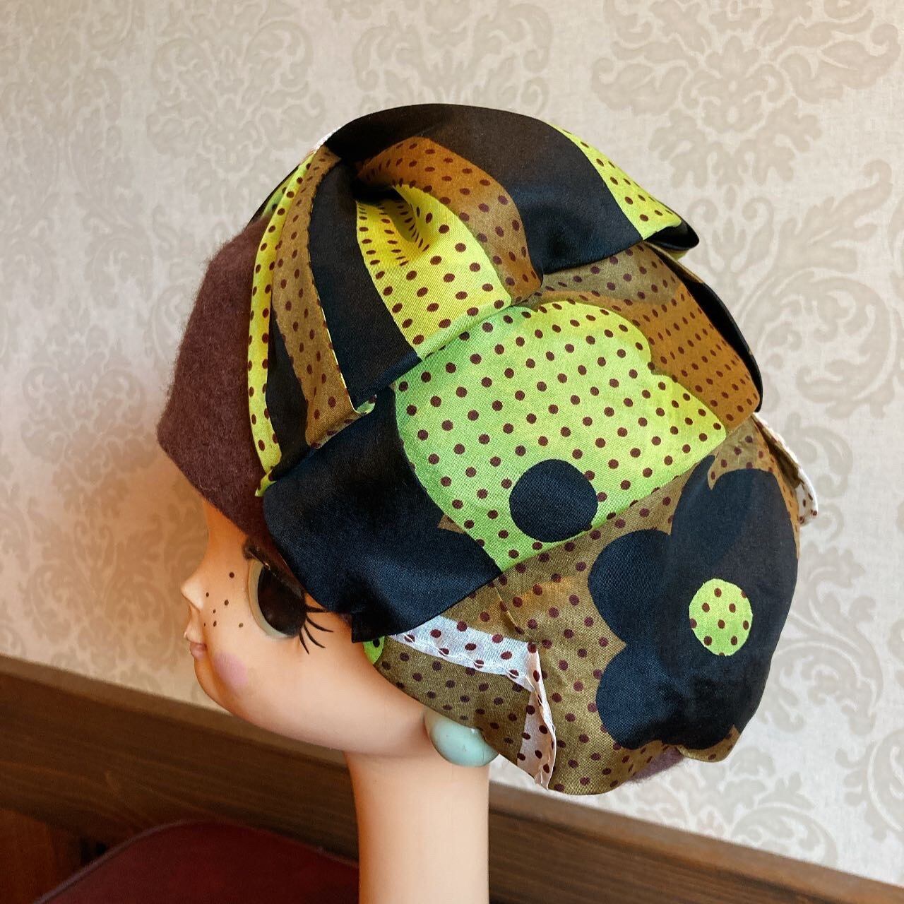 ★ブラウンのベレー帽に、ドット×レトロフラワーのスカーフがとても可愛いです♪